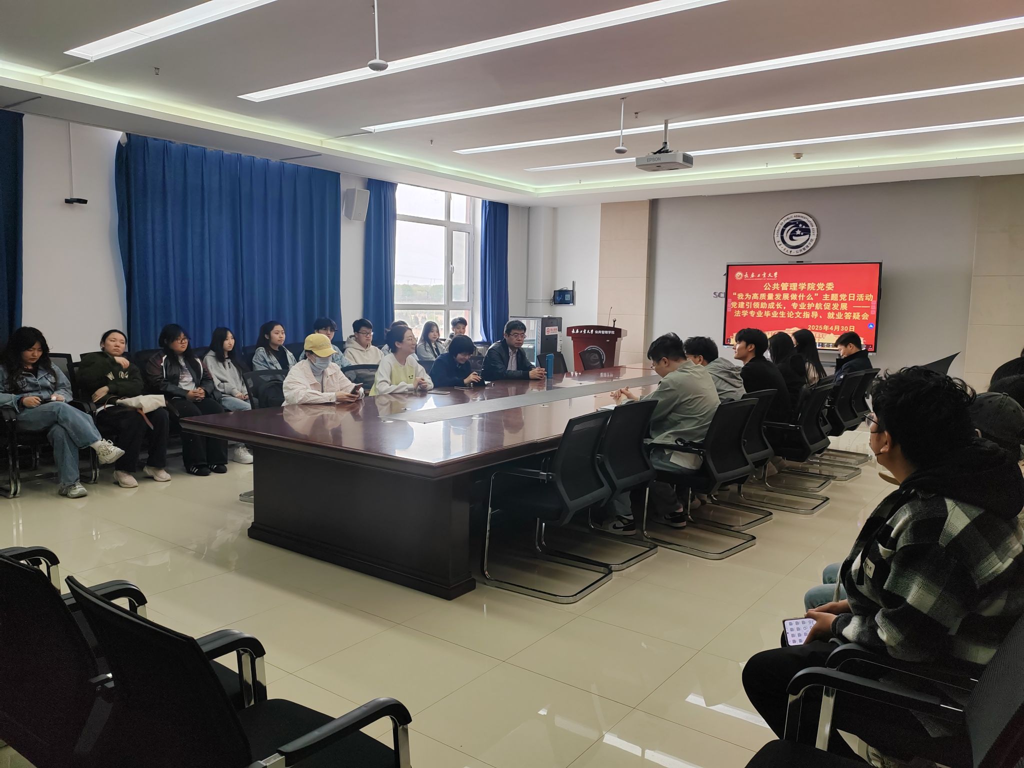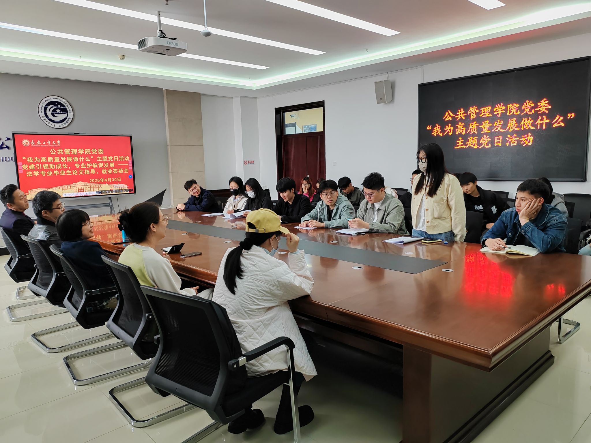 (通讯员:崔元慧)2025年4月30日,米兰milan官方网站党委紧扣“我为高质量发展做什么”主题,组织法学系党支部在北湖东区401会议室开展法学专业毕业生论文指导与就业答疑会。学院副院长冯娜、法学系党支部书记郭千钰、系主任宋浩及党员教师代表张雪峰、刘备,与法学专业本、研究生毕业生代表面对面交流,围绕毕业论文指导、就业政策解读等热点问题展开深度研讨,以实际行动践行党建与专业建设双融双促。