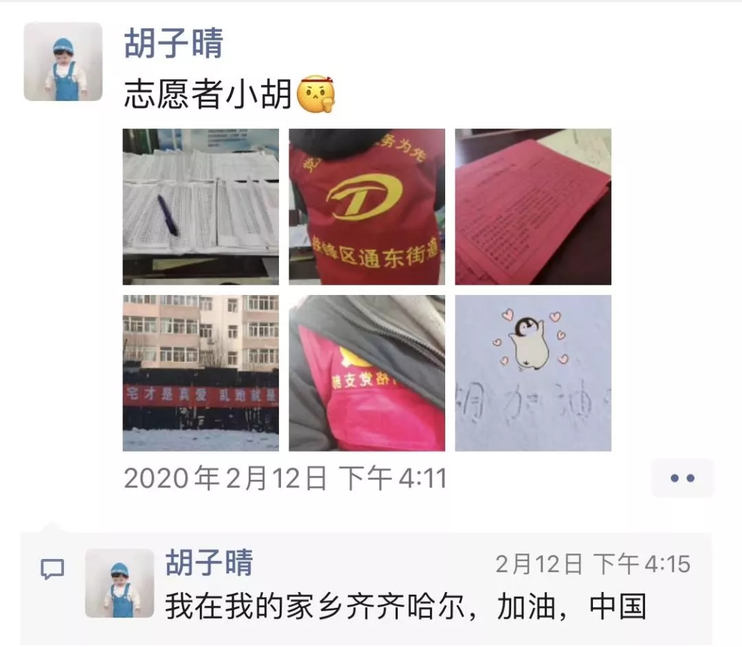 在祖国的边陲黑龙江省齐齐哈尔市,有最美逆行者,他们已经开始第四次援鄂行动,也有一直工作在医疗一线的医务工作者,还有在寒风里恶劣的天气中坚守岗位的警察同志,更有社区工作人员坚守在基层一线,守卫社区居民健康安全。而她也在里面尽自己微弱的一份力量,她叫胡子晴,是米兰milan官方网站公共事业管理专业2019级的学生。她的父母,一个作为医务工作者,一个作为党员一直工作在一线。她深受父母的感召,在回到家自我隔离15天后,第一时间报了名,当了一名志愿者。