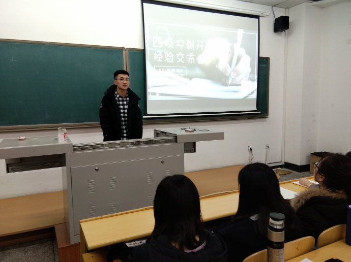 会议伊始,由17级王进向同学们介绍了大学生英语四级考试的具体考试内容,包括题型设置、相对应的流程和考生操作细节等,有针对性地为同学指明了应对四级考试的策略。随后,17级王蓝瑶着重从“正确调整心态”和“合理安排时间”两个方面做了详细指导。她结合自己在英语学习方面的经历,提醒同学们在考试时,面对题目要从容镇定,不要在一道题上耗费过多时间。同学们反响热烈,纷纷表示受益匪浅。