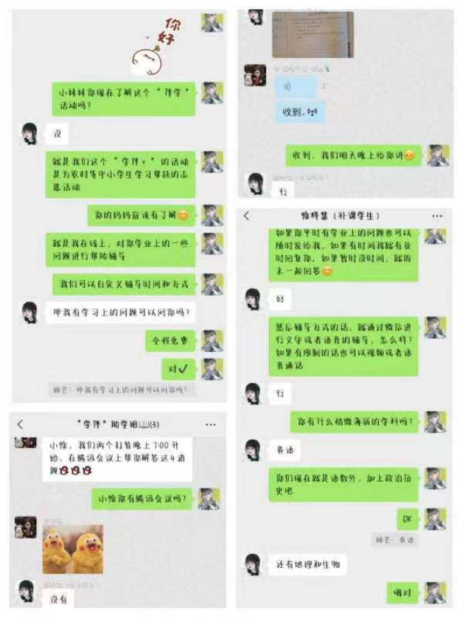 活动开展以来,米兰官网一批政治觉悟高、业务素质好的优秀青年积极主动报名参加,并在第一时间完成结对子。“学伴+”志愿者们根据服务对象年级、学科、主要学业帮助诉求等,组建“一对一”、“多对一”的学业帮帮团,通过微信、QQ等即时通讯软件,及时解答服务对象学业问题,用热情与真诚践行志愿精神,得到了学生家长和学生们的一致认可和好评。接下来让我们一起看看米兰milan官方网站“学伴+”志愿者们的伴学故事与心声。