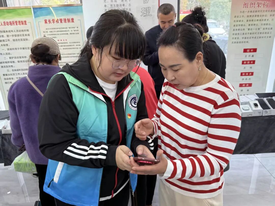 社区智能再生资源回收箱旁现场演示设备操作流程,向老人们讲解“识别可回收品类—扫码投放—积分兑换”全步骤,还贴心在设备上标注“投放口位置”、“求助热线”等关键信息。