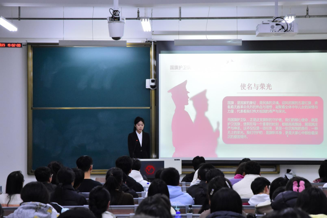 随后,由国旗护卫队成员进行纳新动员,护卫队成员聚焦“坚定政治信念”、“端正仪容仪表”、“友善团队氛围”、“严明纪律意识”以及“精神尊严传承”五大维度向同学们介绍了国护队的使命与职责,更通过展示日常训练影像,生动展现了国护队的精神气质,让同学们深刻感受到这支队伍的庄严与荣光。