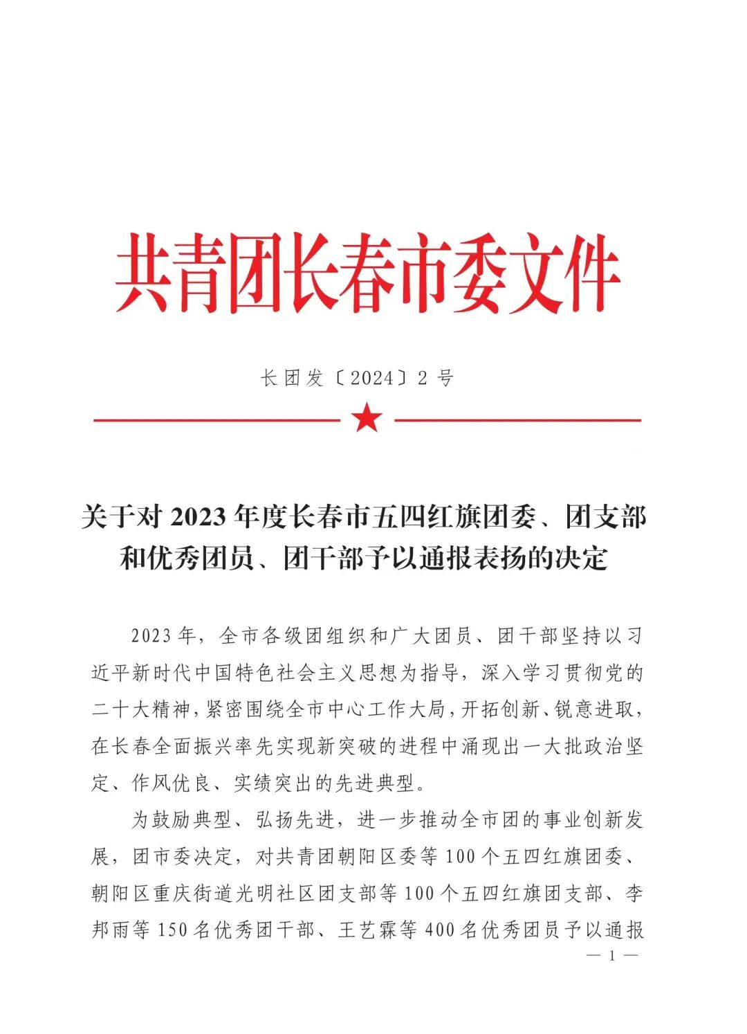 共青团长春市委于近日公布了2023年度“长春市优秀团员”评选结果,米兰官网210903班杨茉同学荣获2023年度“长春市优秀团员”荣誉称号。
