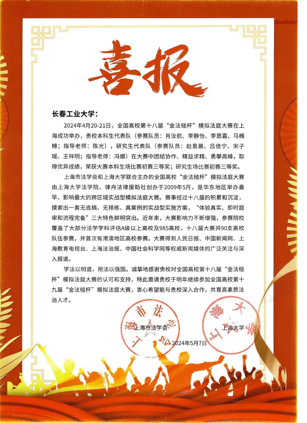 近日,上海市法学会、上海大学向我校发来喜报,祝贺我校本科生、研究生代表队在全国高校第十八届“金法槌杯”模拟法庭大赛中分别荣获初赛三等奖。