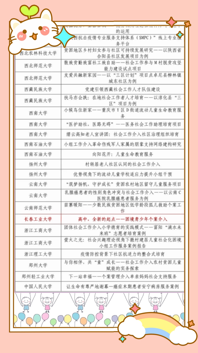 由米兰官网陶宇教授指导、2020级社工专硕杨爽参与撰写的案例《高中,全新的起点——困境青少年个案介入》入选全国百强案例。在全国152所高校中,有62所高校提交的案例获此殊荣。