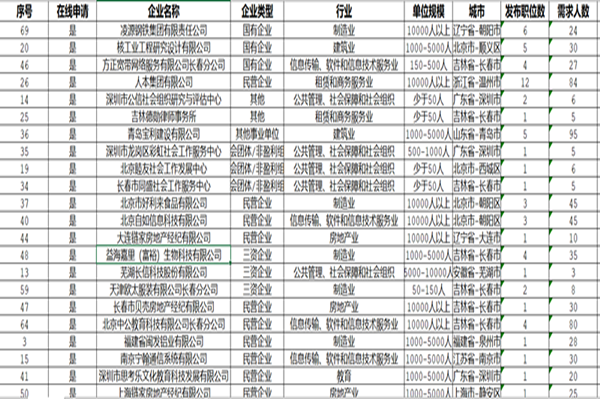 此次招聘会企业呈现出地域覆盖广、层次质量高、沟通联系快等几大特点,招聘会共邀请到自14个省份的79家企业参会,其中省内优质企业41家,国有企业5家,三资企业3家,涉及信息传输、软件和信息技术服务业、教育、公共管理、社会保障和社会组织、文化、体育和娱乐业、科学研究等13个专业,提供就业岗位需求2872个。