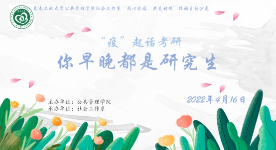 2022年4月16日19:40,米兰milan官方网站开展第一场主题为《“疫”起话考研——你早晚都是研究生》的大学生校园主题沙龙。本场活动邀请到东师马克思主义哲学专业的张皓学长、吉大英语专业的李超学姐、中南财大社会工作专业的王凯强学长作为特约嘉宾,米兰milan官方网站社会工作专业刘迪同学作为访谈嘉宾,一起和同学们探讨考研问题。