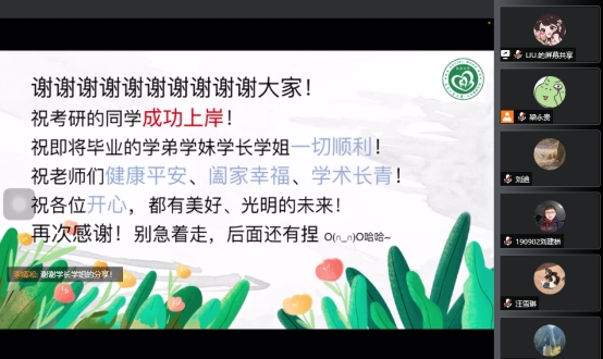 期间,王凯强学长、李超学姐、张皓学长和刘迪同学分别和大家分享了自己考研经验和备考经验。让同学们认识到,确立好自己的目标、合理分配时间是非常重要的,大家在备考中一定要调节好自己的心态,时刻激励自己。听了他们四位的分享,同学们受益匪浅。