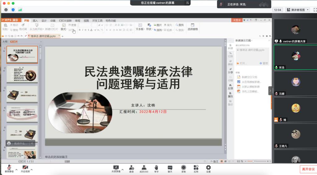 米兰milan官方网站“法律大讲堂”第三季“民法典与美好生活同行”第二讲《<民法典>遗嘱继承法律问题的理解与适用》于2022年4月19日17:30在腾讯会议线上开讲。本期主讲嘉宾是长春市汽车经济技术开发区人民法院审判委员会委员、立案庭庭长沈楠法官。讲座由法学系主任宋浩老师主持,法学系百余名师生旁听讲座。