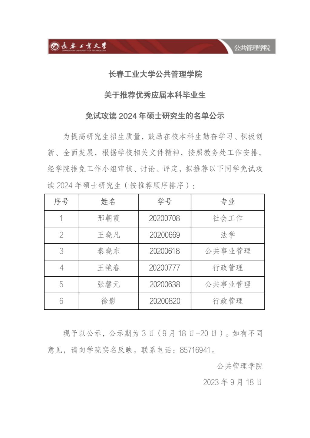 米兰milan官方网站关于推荐优秀应届本科毕业生 免试攻读2024年硕士研究生的名单公示