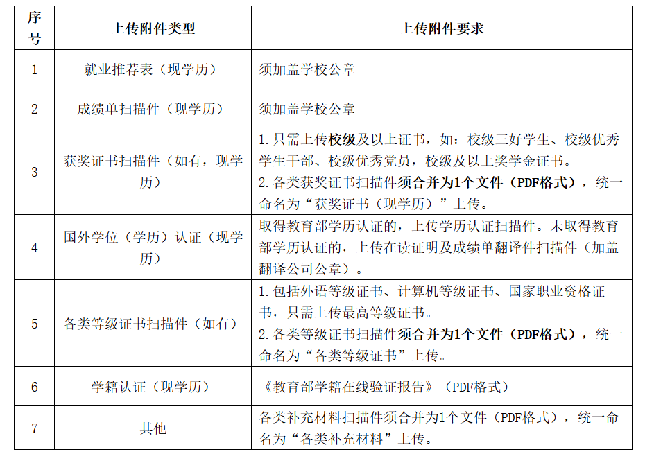 (一)应聘毕业生应认真阅读应聘条件,按照要求在网上填写报名信息,应确保所填信息完整、准确、真实。应聘毕业生应通过招聘平台及时、规范上传个人应聘附件材料,附件材料文档数量一般不超过7个,应确保应聘材料能正常打开、清晰显示,因应聘材料不能正常打开、图像不清晰或未按规范要求上传必需材料且影响简历筛选判断或材料真实性存疑的,将影响简历筛选结果。上传附件具体要求如下: