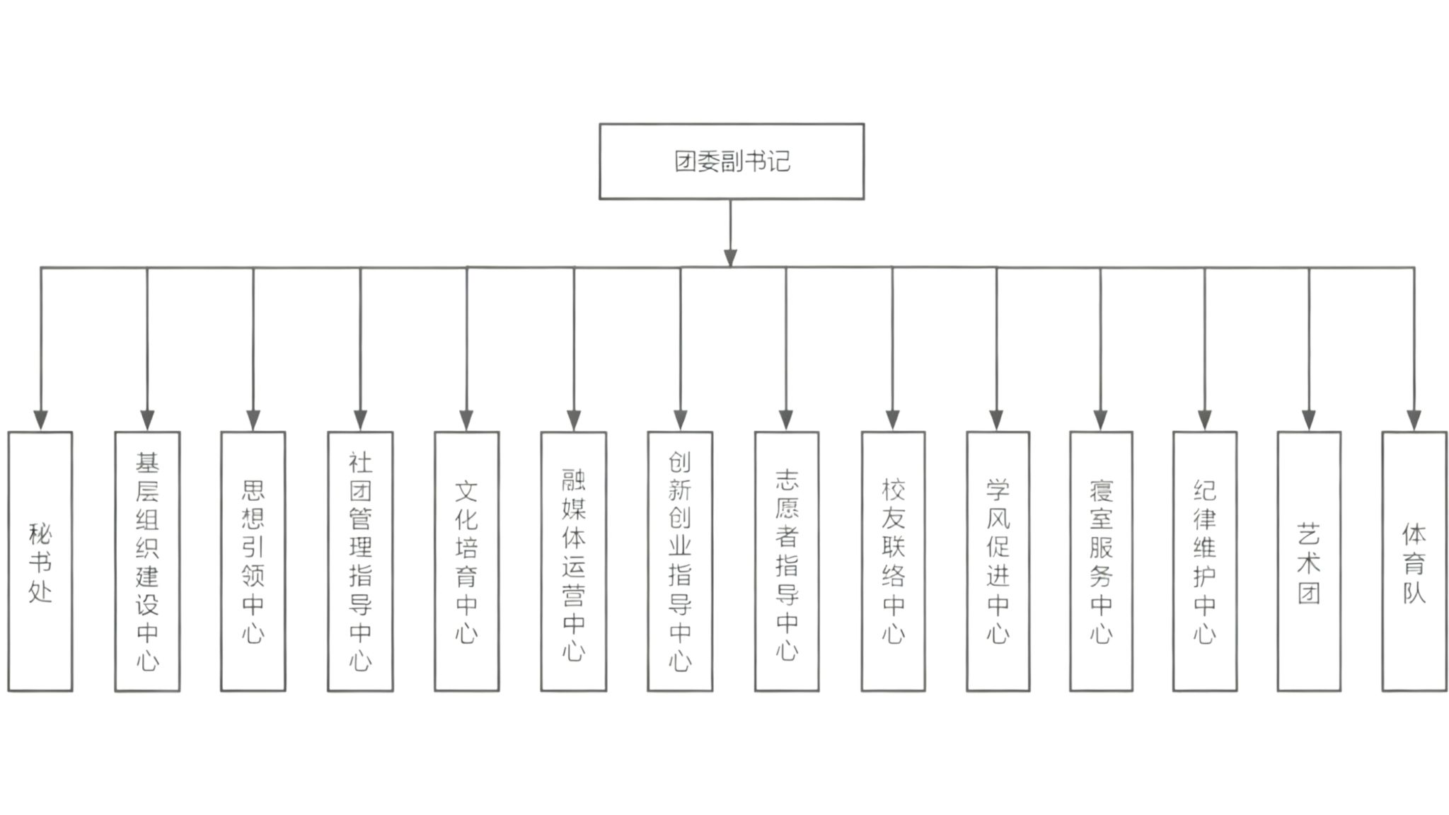 团委现设副书记2名、秘书处、基层组织建设中心、思想引领中心、社团管理指导中心、文化培育中心、融媒体运营中心、创新创业指导中心、志愿者指导中心、校友联络中心、学风促进中心、寝室服务中心、纪律维护中心、艺术团和体育队十四个职能部门,各职能部门在分工合作基础上,依章办事,为同学服务,接受同学监督。
